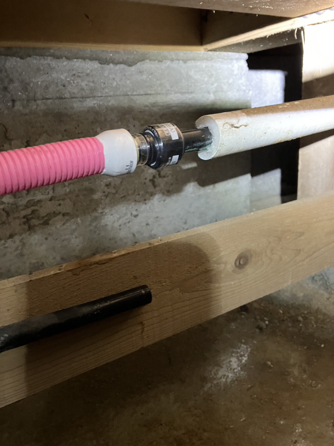 床下点検口より調査を行ったところ、給湯器からの銅管にて漏水を確認。